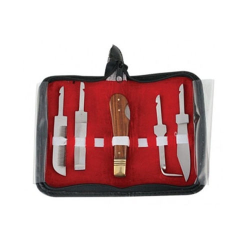 Hoof Knife Kit. Available in a compact, elegant leather case with zipper. Set includes Wooden handle with 6 different types of interchangeable blades. (Standard Size)
